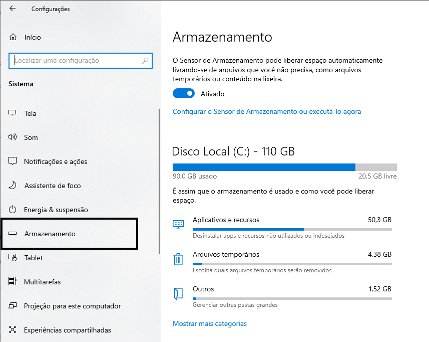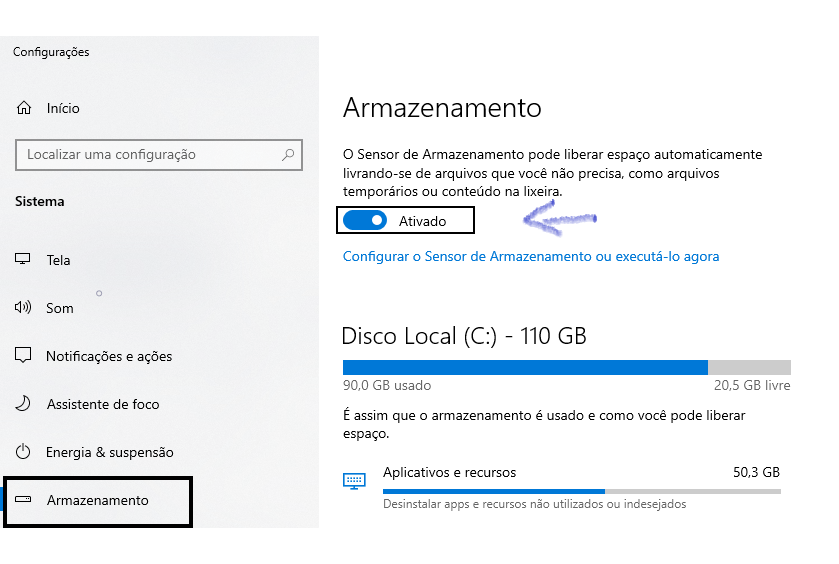 - Como fazer: Em Configurações de Armazenamento, ative o “Sensor de Armazenamento”.