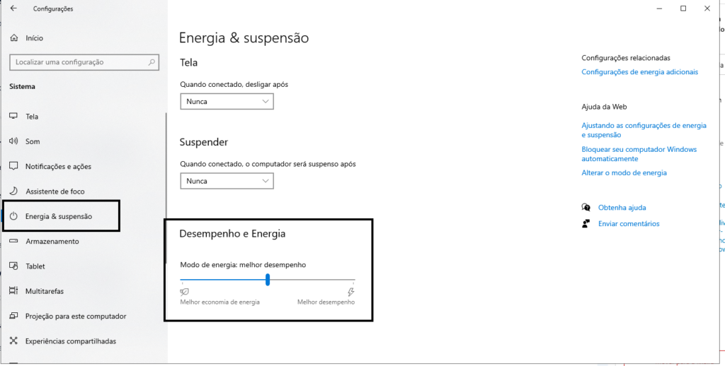 - Como fazer: Vá em Painel de Controle > Hardware e Sons > Opções de Energia e selecione “Alto Desempenho”.