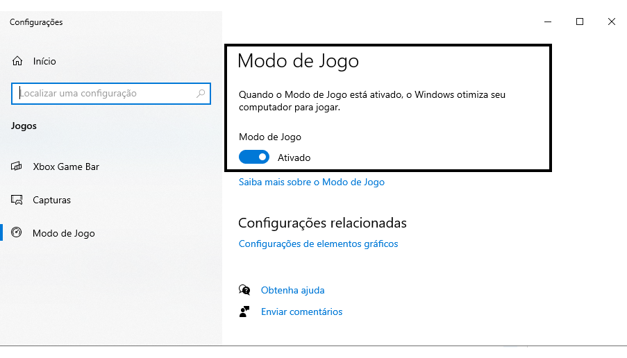 - Como fazer: Procure por “Modo de Jogo” no menu iniciar e ative a chave.