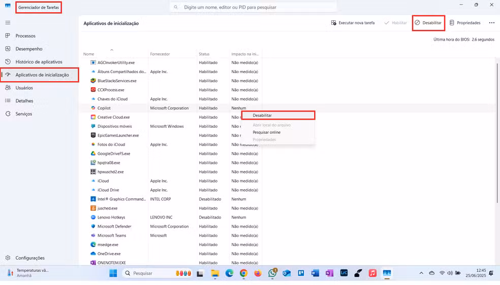 Ctrl + Shift + Esc, vá na aba “Aplicativos de Inicialização” e desabilite tudo o que não for essencial.